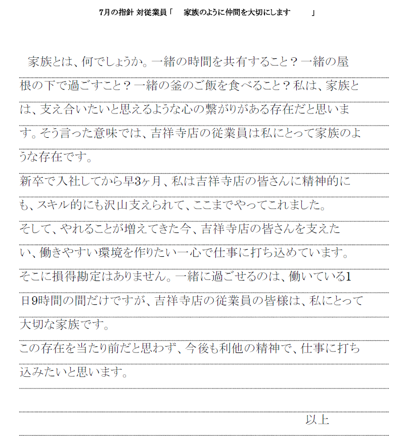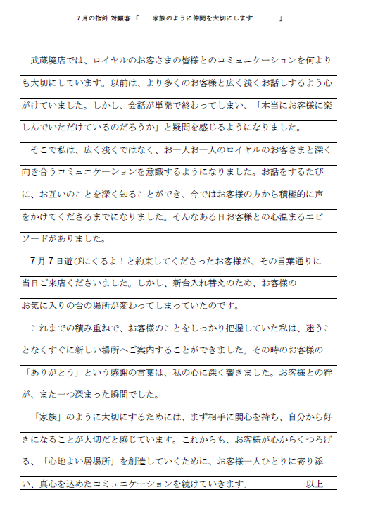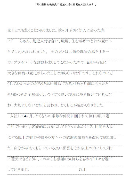弊社では、毎月経営指針に対する従業員からの「物語」を募り、全てに役員が目を通したのち月次で実施する全体集会にて表彰を行っております。