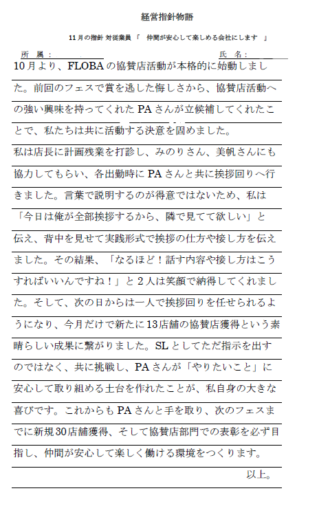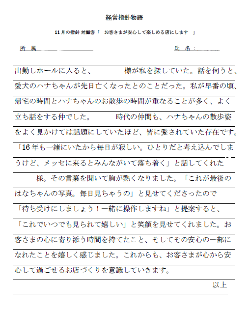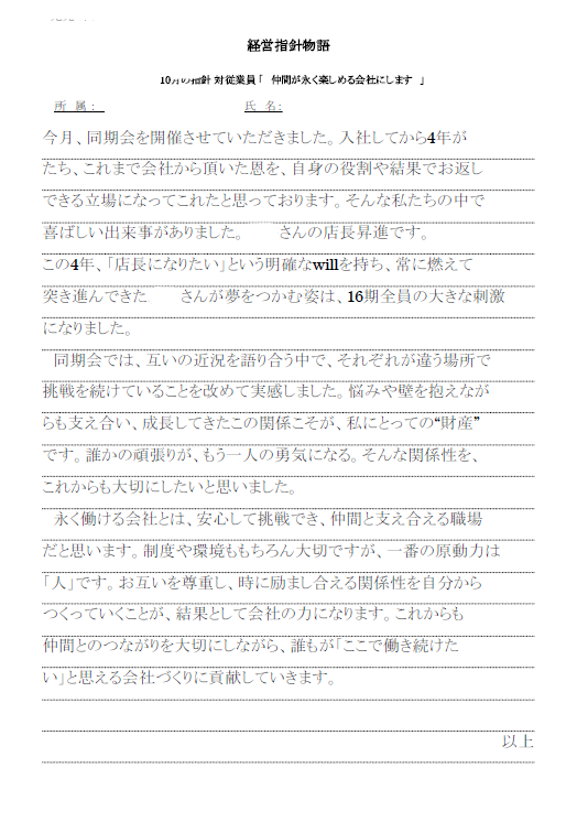 弊社では、毎月経営指針に対する従業員からの「物語」を募り、全てに役員が目を通したのち月次で実施する全体集会にて表彰を行っております。 いくつかピックアップしてご紹介いたします!ぜひ、メッセの日常をご覧ください!